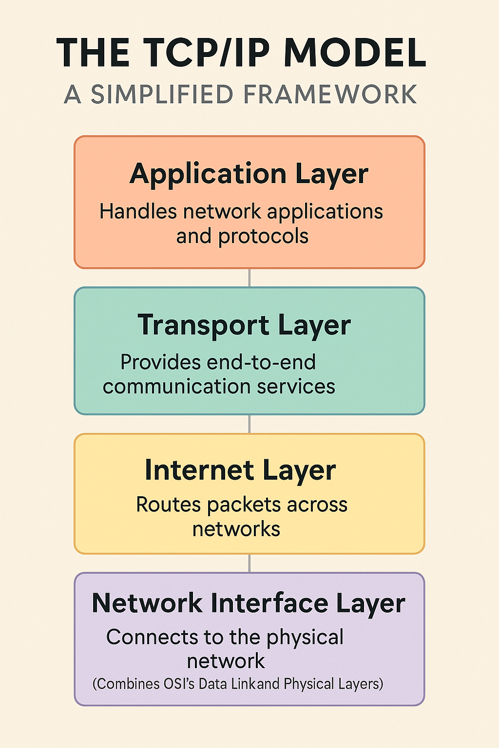 The Internet operates more practically on a simpler model called the Internet Protocol Suite, commonly known as the TCP/IP model. It condenses the layers of the OSI model into four layers:
