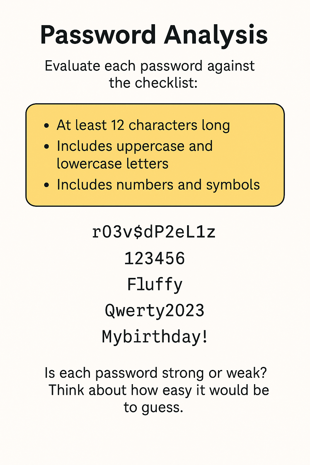 You’ll be given a set of example passwords. For each one, ask yourself: