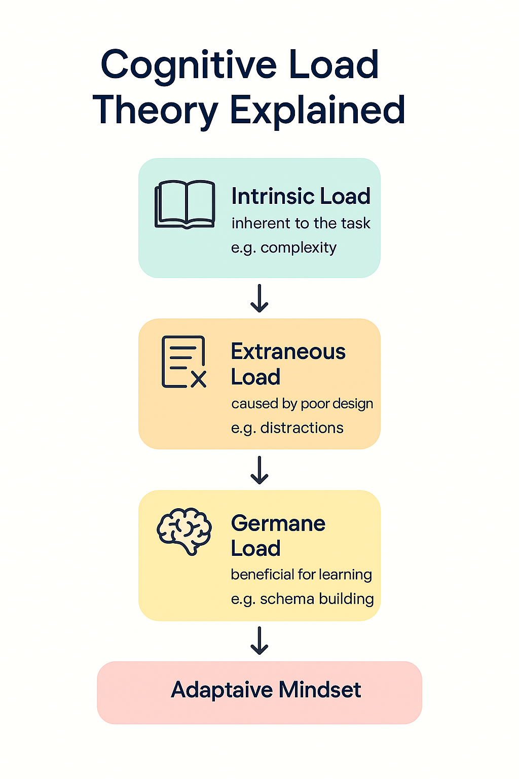 Understanding how the human brain processes and stores information is critical for effective learning. Cognitive Load Theory (CLT) postulates that our working memory has limited capacity and can only hold a few pieces of information at any given time. To learn optimally, it is essential to manage this cognitive load efficiently.