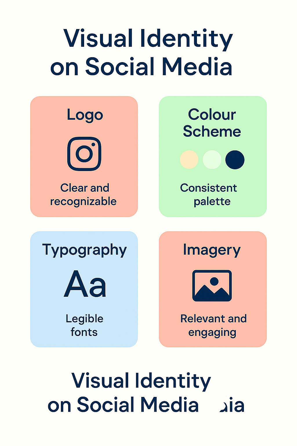 Visuals are an integral part of your brand identity on social media. They can convey your brand personality quickly and effectively. Elements of visual identity include: