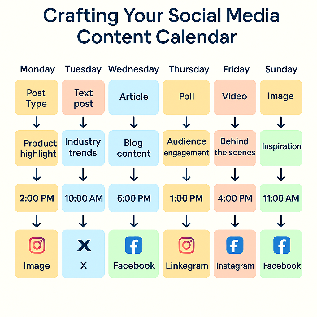 Creating a content calendar is essential for consistent and strategic social media presence. It helps you plan out when and what you will post, ensuring that your content aligns with your brand personality and business goals.