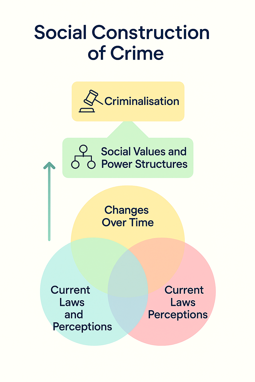 The process of criminalisation involves societal decisions about which behaviours are harmful and should be prohibited by law. These decisions are influenced by social values, political ideologies, and power structures. Understanding the social construction of crime allows us to recognise that the boundaries between lawful and criminal behaviour are not always clear or fixed and that they can change over time.