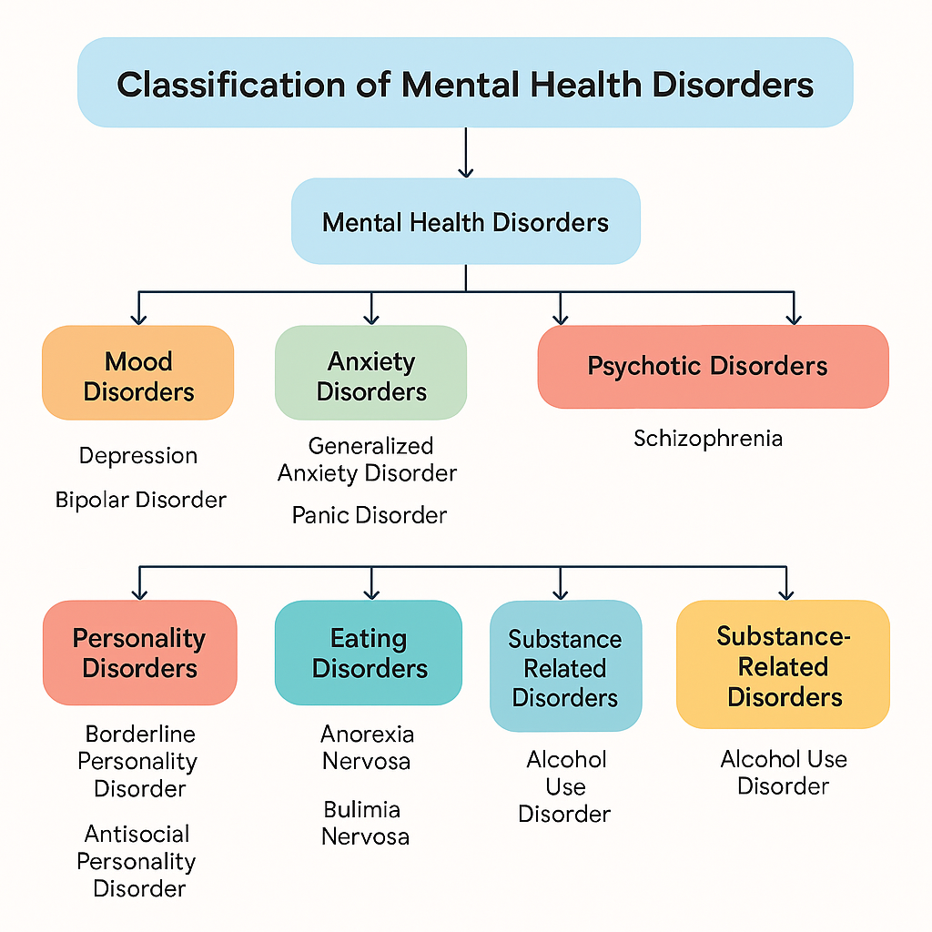 The classification system is divided into different groups, such as mood disorders, anxiety disorders, psychotic disorders, and personality disorders, among others. Each group includes specific types of disorders, which are further categorized based on their characteristics and symptoms.